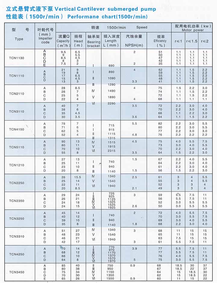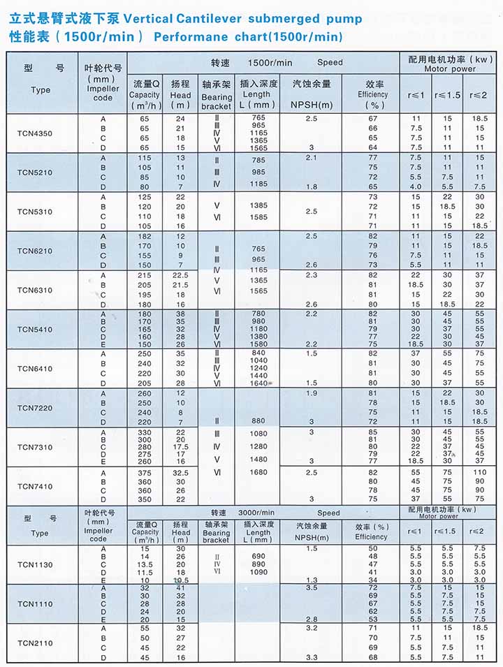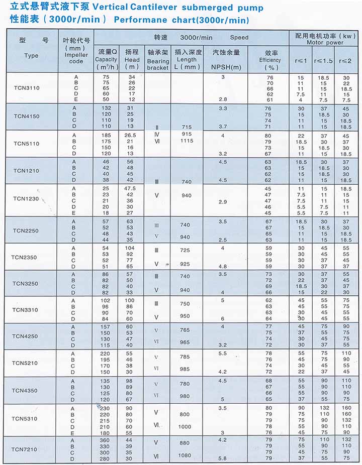 概述: TCN型泵是立式、單級、單吸、懸臂式液下泵,用圓柱管聯結泵的水力部件和底座。出液管同圓柱管分開,不用采取軸封措施,泵在液下部位不設軸承,可以輸送含有固體顆粒的介質。根據介質中固體顆粒的大小和性質不同,泵葉輪又分為兩種型式,即閉式葉輪(TCN型)加開式葉輪(TCF型)當介質含顆粒較多而尺寸較大時,選用開式葉輪。泵的插入深度根據電機極數,所配用軸承架的規格大小可以在700~1800mm范圍內變化。當需要時,泵可以配帶吸入管。 流量Q:5-400m3/h 揚程H:2.5-110m 溫度t:-20℃~+200℃ 用途: 化工、石油化工、采礦、造紙業、水泥廠、煉鋼廠、自來水廠、食品等行業。 輸送各種無機酸和有機酸,各種堿性溶液、磷復肥裝置的料漿。 水力特性: 可以根據泵輸送介質的性質和運行條件選擇泵體和葉輪的型式。葉輪可供選擇的型式