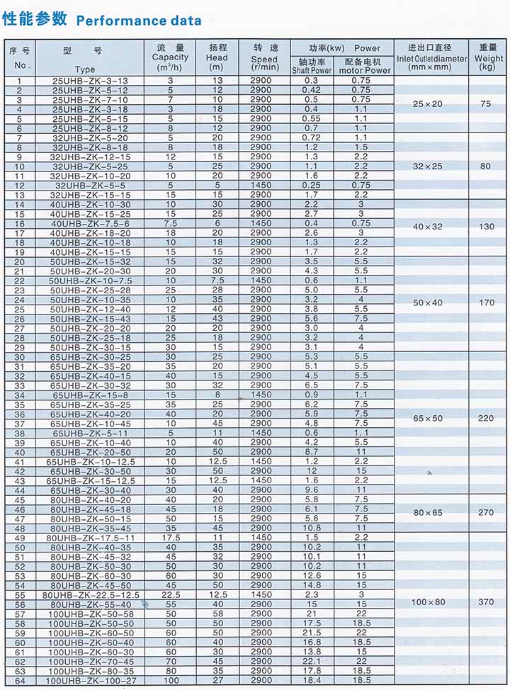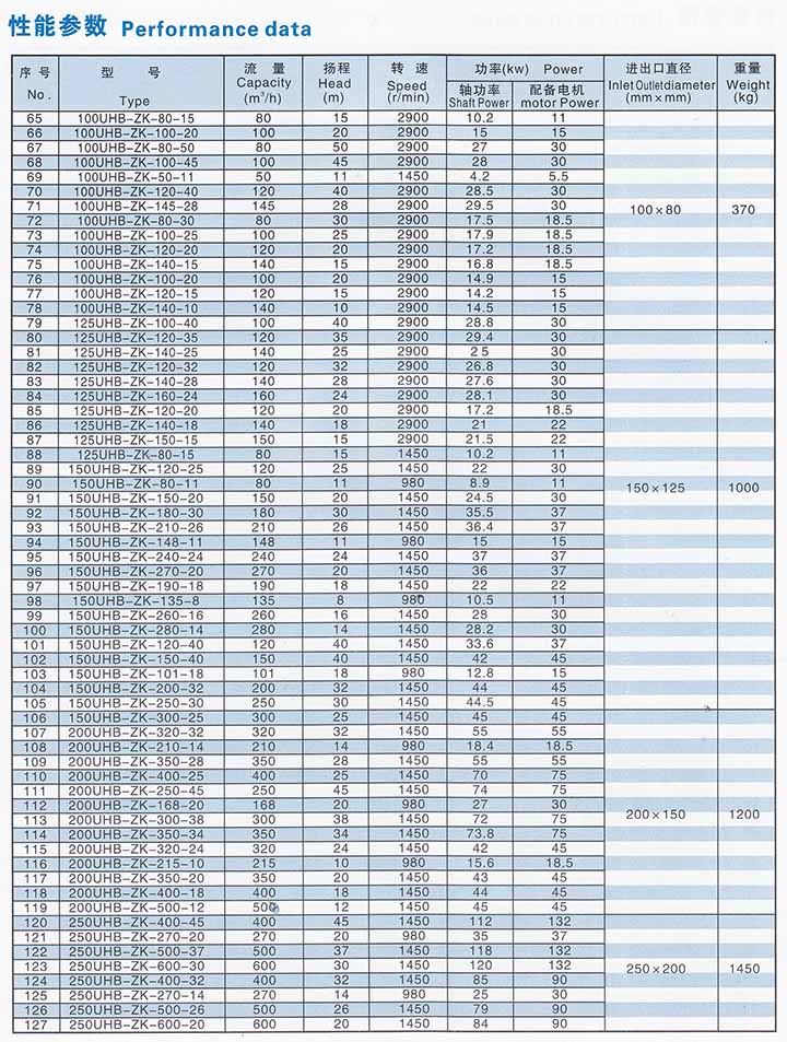5.主要技術參數:使用溫度-20℃~80℃(對特殊要求、使用改性材質,可提高到105℃),進口φ32mm~φ250mm。流量5~600m3/h,揚程50m以內。